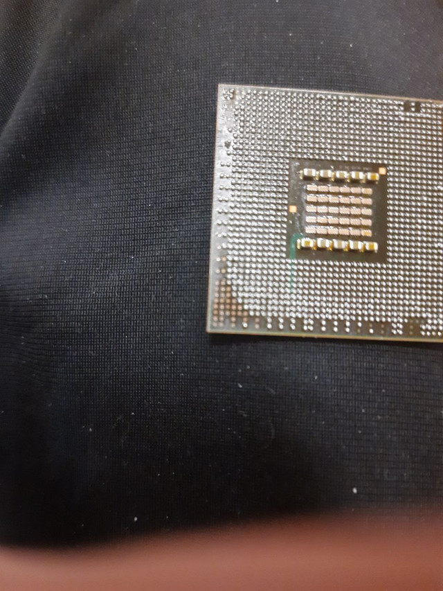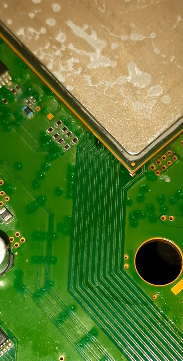 Восстановив его и посадив чип включил плату. Но, естесственно, ничего не изменилось. Потому что главная проблема теперь - проц. Не стал даже читать ошибки, насадил обратно пластину герметиком и оставил на 1 день. Через день, когда герметик высох, снял проц и обнаружил там следующее:
