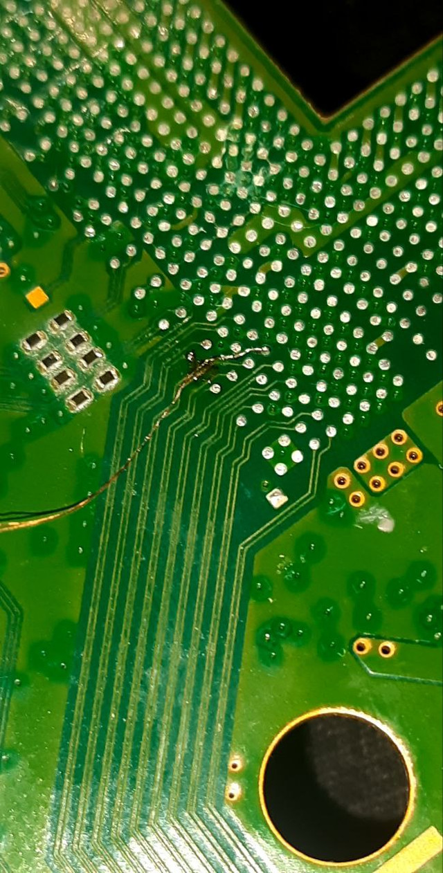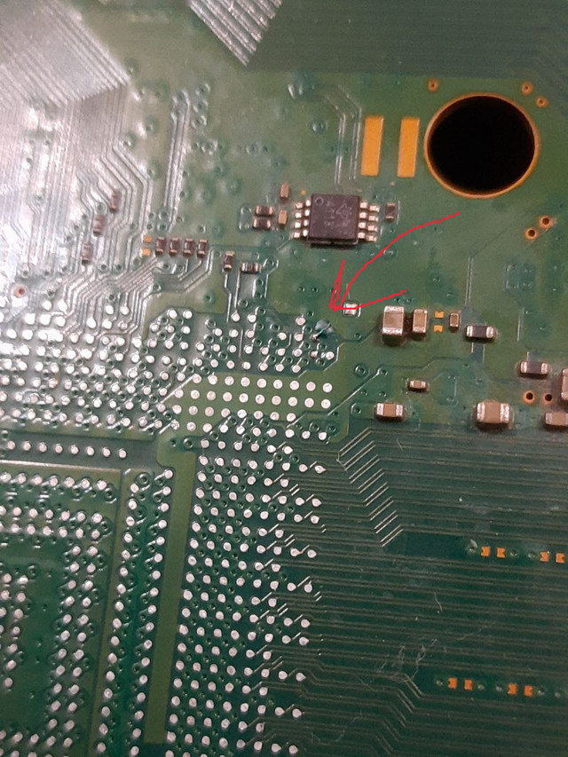 Решил все равно реболлить RSX, потому что проблема в нем 100% была. Сняв чип, обнаружил вырванный на плате контактный пятак на углу - причина 4401.